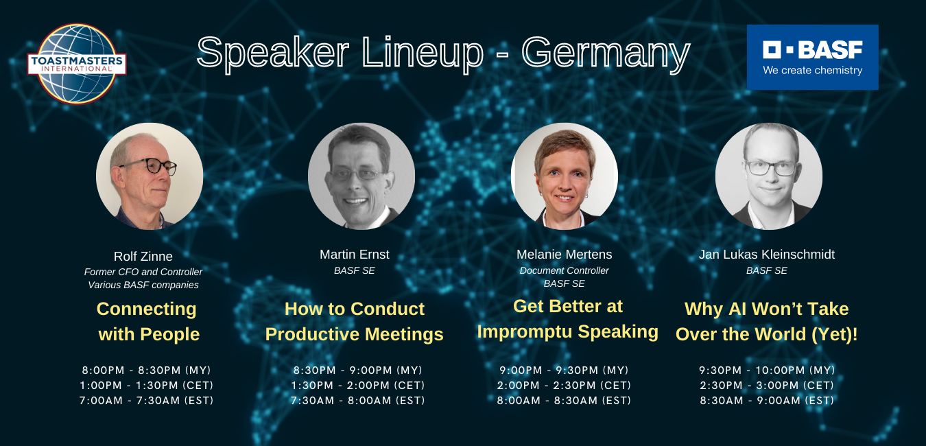 BASF’s Toastmasters Clubs all over the World organize an online “Open House” on Friday 13 November 2020. The events will start 11am CET in Malaysia, transfer to Germany (1pm CET) and finish in North America (3pm CET). The whole event will focus on Leadership – Communication – Networking – Education with speakers of diverse cultural and professional background sharing their perspective on these topics.