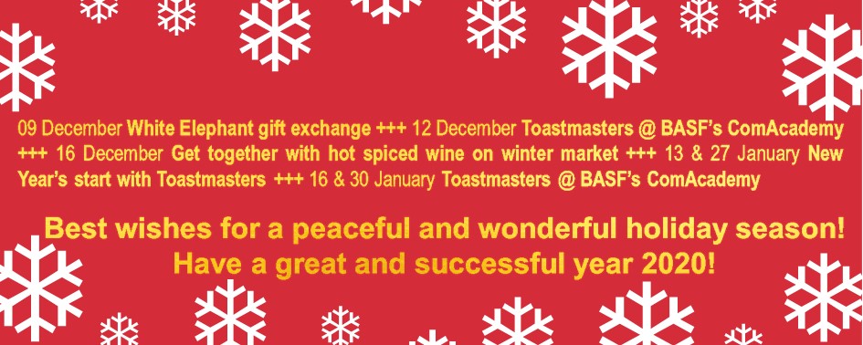 Dear fellow Toastmasters,have a peaceful and wonderful holiday season 2019/2020. We wish you a great and successful new year. Hoping to see you for the White Elephant gift exchange, the …