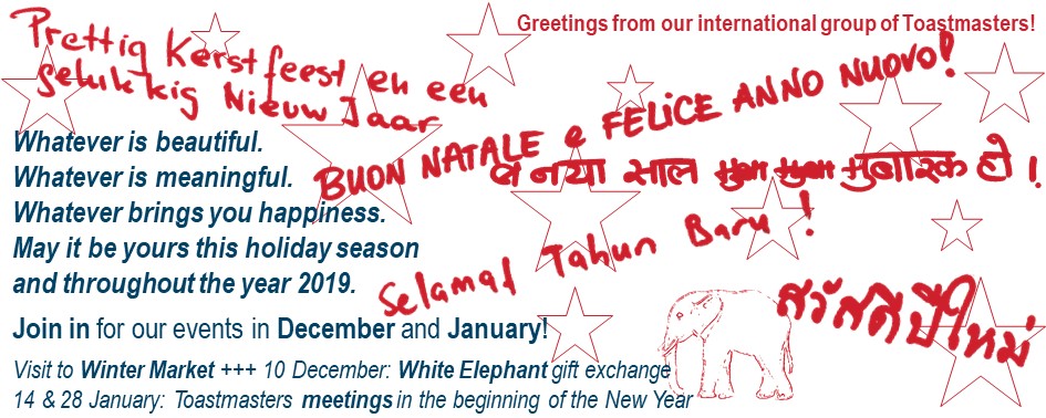 It would be a great pleasure to see you at our meeting on 10 December where we will have our legendary White Elephant Gift Exchange, speech presentations of our club members and other activities to train public speaking skills. We also in invite you to join in for a glas of hot wine and seasonal food on Ludwigshafen’s winter market! 2019 will be perfect to improve your skills of leadership and rhetoric — visit our meetings on January 14th and 28th!